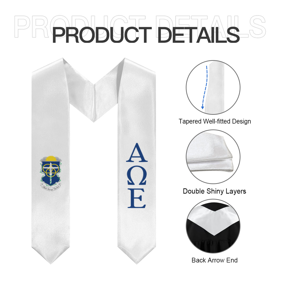 Celebrate your Alpha Omega Epsilon journey with this white and blue stole featuring the sorority crest and official Greek letters. Designed to highlight chapter pride in a clean, polished way, it’s perfect for graduation day, meaningful photos, and keepsake memories that honor your accomplishments.