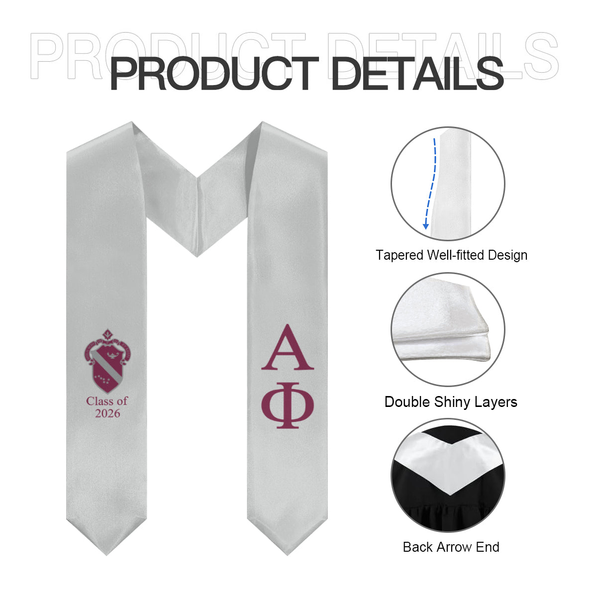Alpha Phi + Crest + Class of 2026 Graduation Stole - Light Silver & Bordeaux