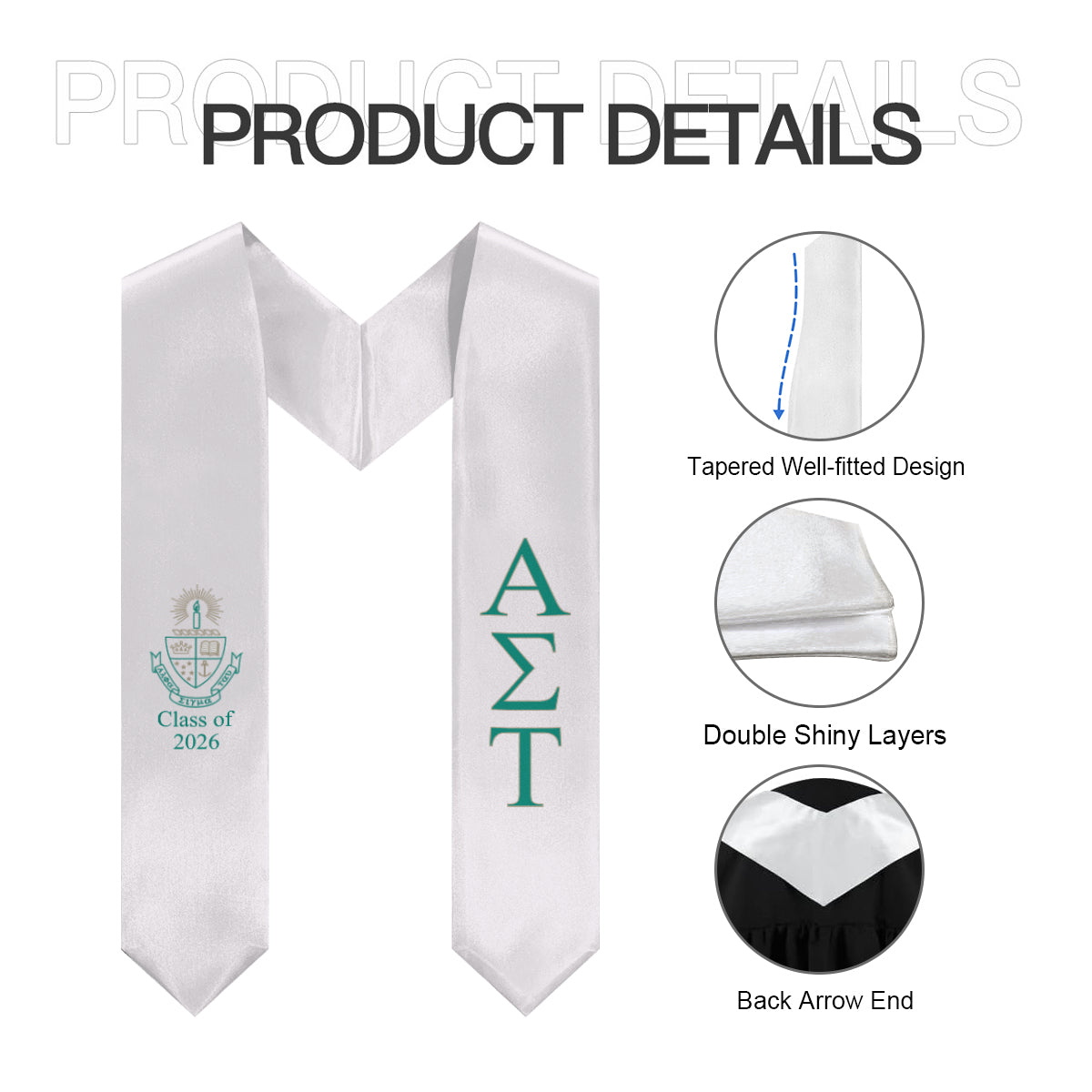 Celebrate your Alpha Sigma Tau sisterhood in style with this Class of 2026 stole in white, green, and gold. Featuring the official ΑΣΤ crest and graduation year accents, this stole is perfect for walking the stage, capturing senior photos, or keeping as a treasured keepsake of your collegiate journey.