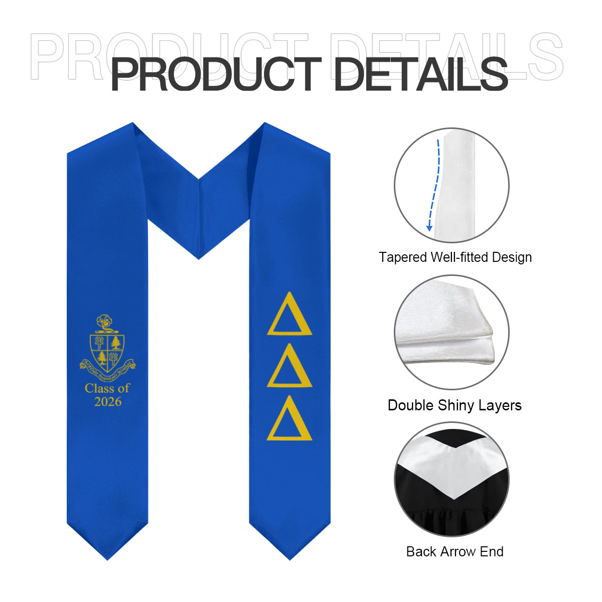 Celebrate your Tri Delta journey with this elegant graduation stole featuring the official crest and Class of 2026 detail. Designed in cerulean blue with gold accents, this stole offers a bright, polished look that stands out beautifully against your graduation gown.
