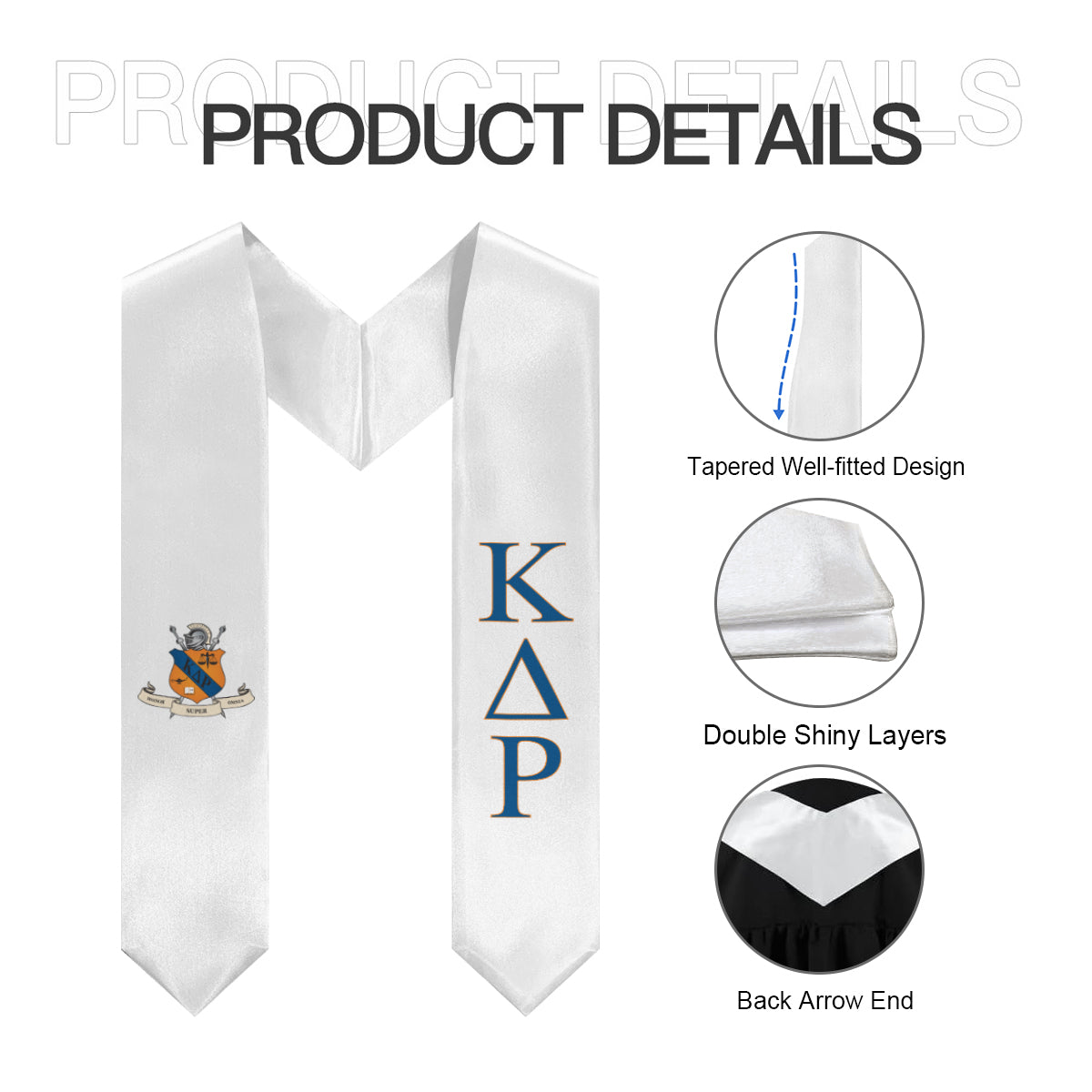 Honor your Kappa Delta Rho legacy with this white, blue, and orange stole featuring the fraternity coat of arms. Designed to stand out on graduation day, it’s a meaningful way to represent your chapter during the ceremony, in photos, and beyond as a lasting keepsake.