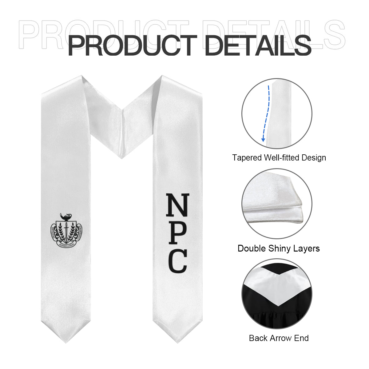 Celebrate your sorority pride and Panhellenic sisterhood with this NPC (National Panhellenic Council) graduation stole in classic white and black. Featuring the official NPC crest printed in crisp detail, this elegant stole is the perfect finishing touch for your graduation day.