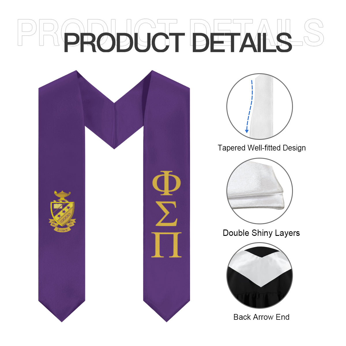 Stand out on graduation day with this Phi Sigma Pi stole, crafted in deep Purple with bold Gold letters and the official fraternity crest. Designed to honor your brotherhood and achievements, this stole is the perfect finishing touch for commencement. A lasting keepsake, it proudly showcases your connection to ΦΣΠ long after graduation.