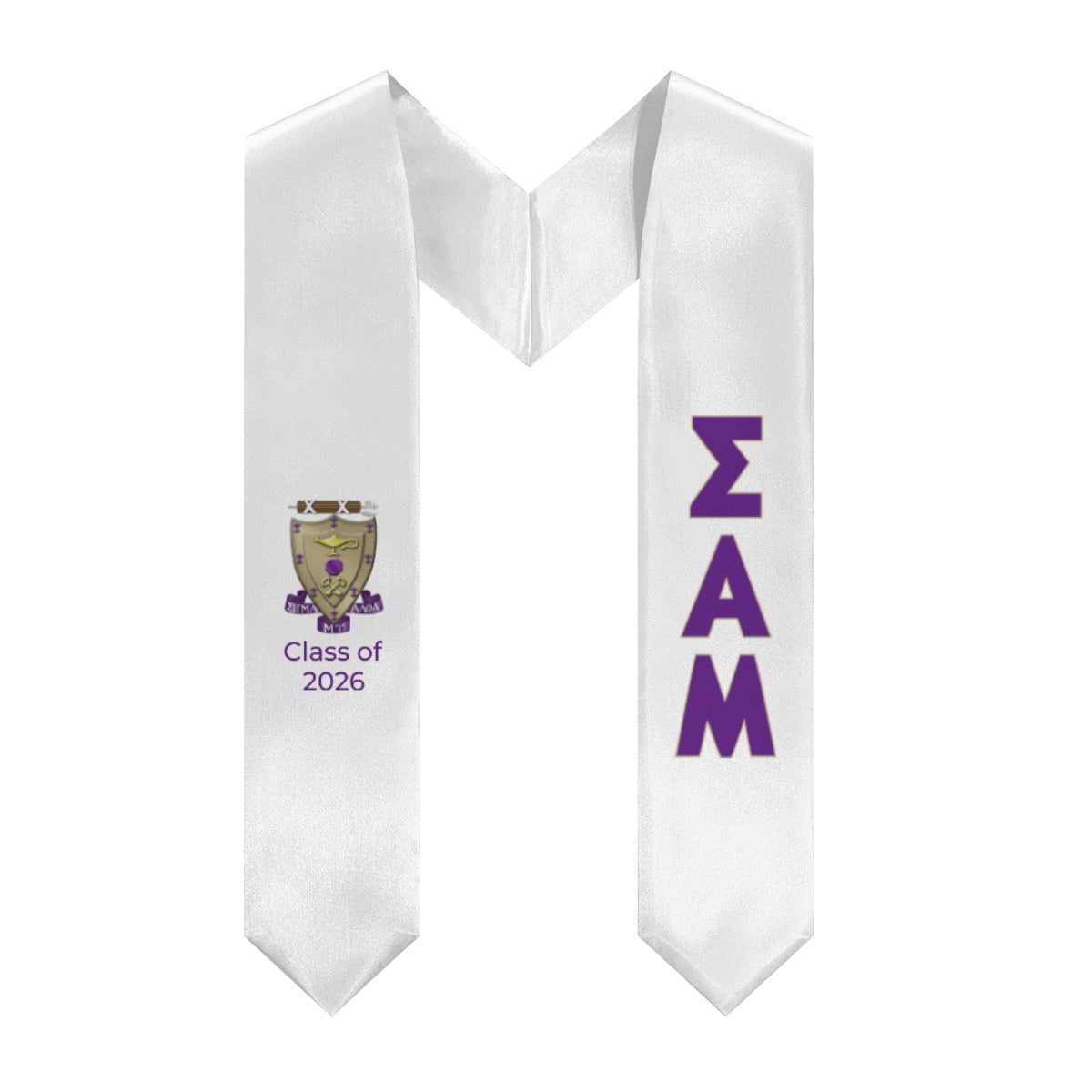 Celebrate the Class of 2026 with this Sigma Alpha Mu graduation stole featuring the fraternity’s coat of arms. Designed in white with purple and gold accents, it’s a meaningful way to honor your time in SAM and mark graduation day with pride.