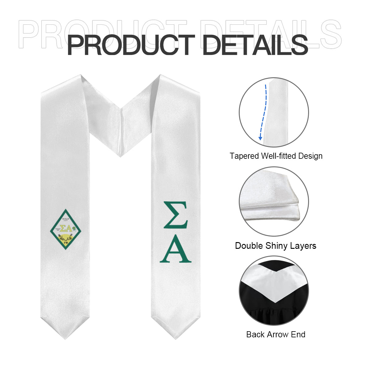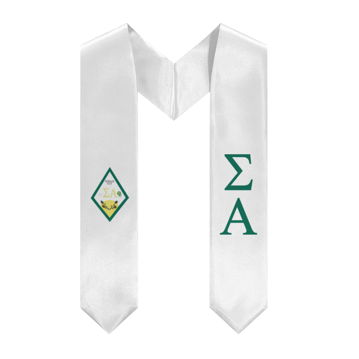 Celebrate your Sigma Alpha journey with this elegant graduation stole in white and emerald. Featuring the official ΣΑ crest, this design blends tradition with a polished look that’s perfect for commencement, senior photos, and as a keepsake of your sorority experience. A meaningful accessory to honor your achievements and sisterhood.