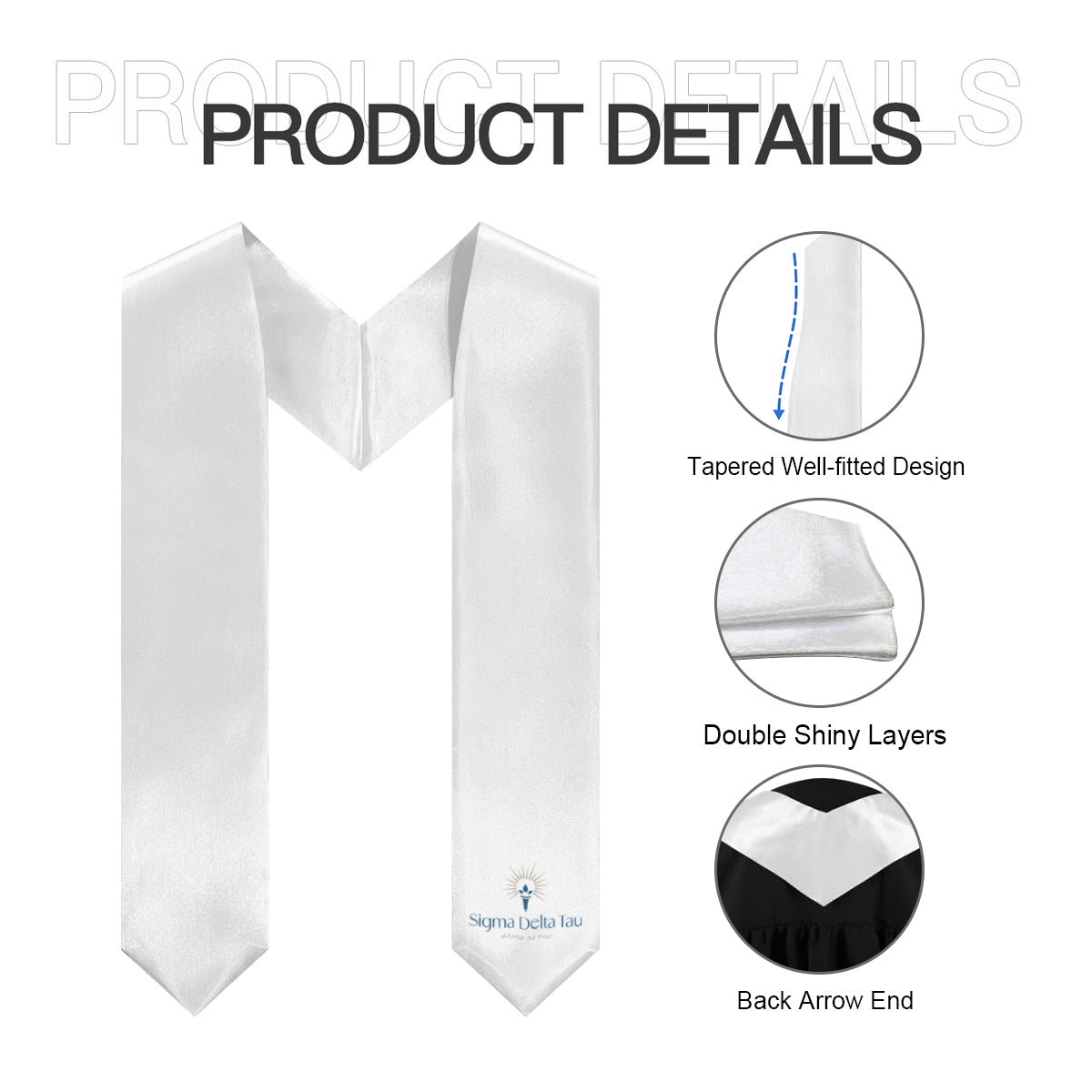 Celebrate your Sigma Delta Tau journey with this clean, white stole featuring the sorority logo. Designed for a timeless and understated look, it’s perfect for graduation day, capturing photos, and honoring your chapter pride with simplicity and style.