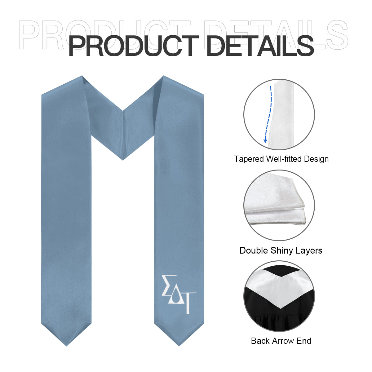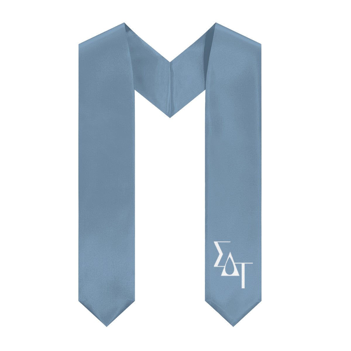 Show your Sigma Delta Tau pride with this droplet blue stole featuring simple white logo letters placed in the bottom left. Designed with a minimalistic look, this stole is perfect for graduates who want an understated yet meaningful way to represent their chapter on graduation day, in photos, and beyond.