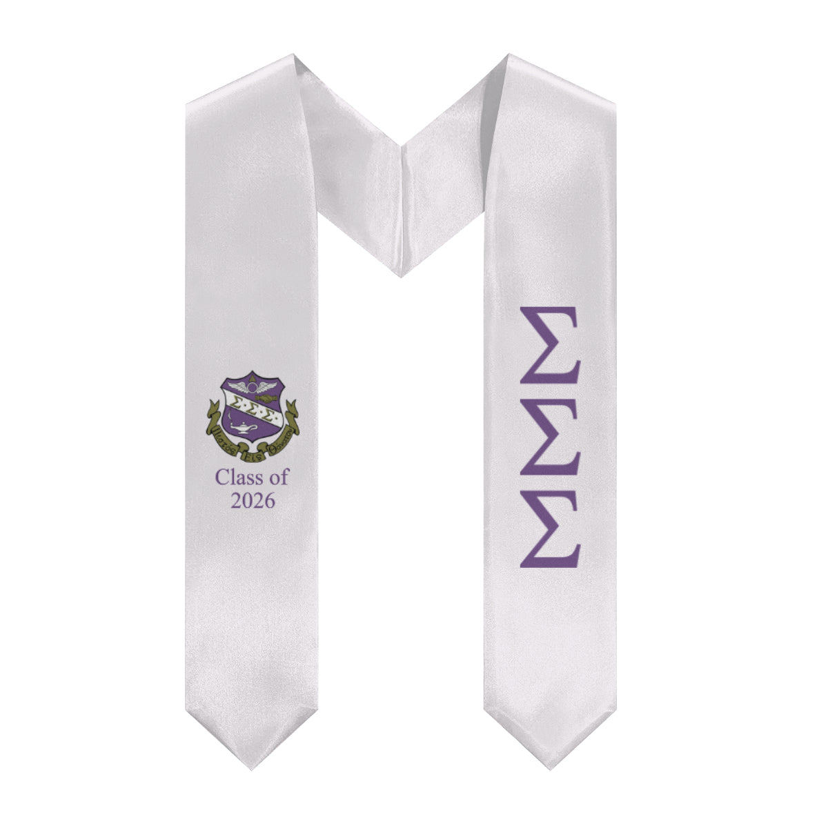 Step into graduation with Tri Sigma pride! This Class of 2026 stole in white and purple features bold ΣΣΣ letters, the Tri Sigma crest, and a chic “Class of 2026” accent. Perfect for walking the stage, snapping memorable photos, or showing off your sisterhood, this stole is a fun and stylish keepsake you’ll treasure forever.