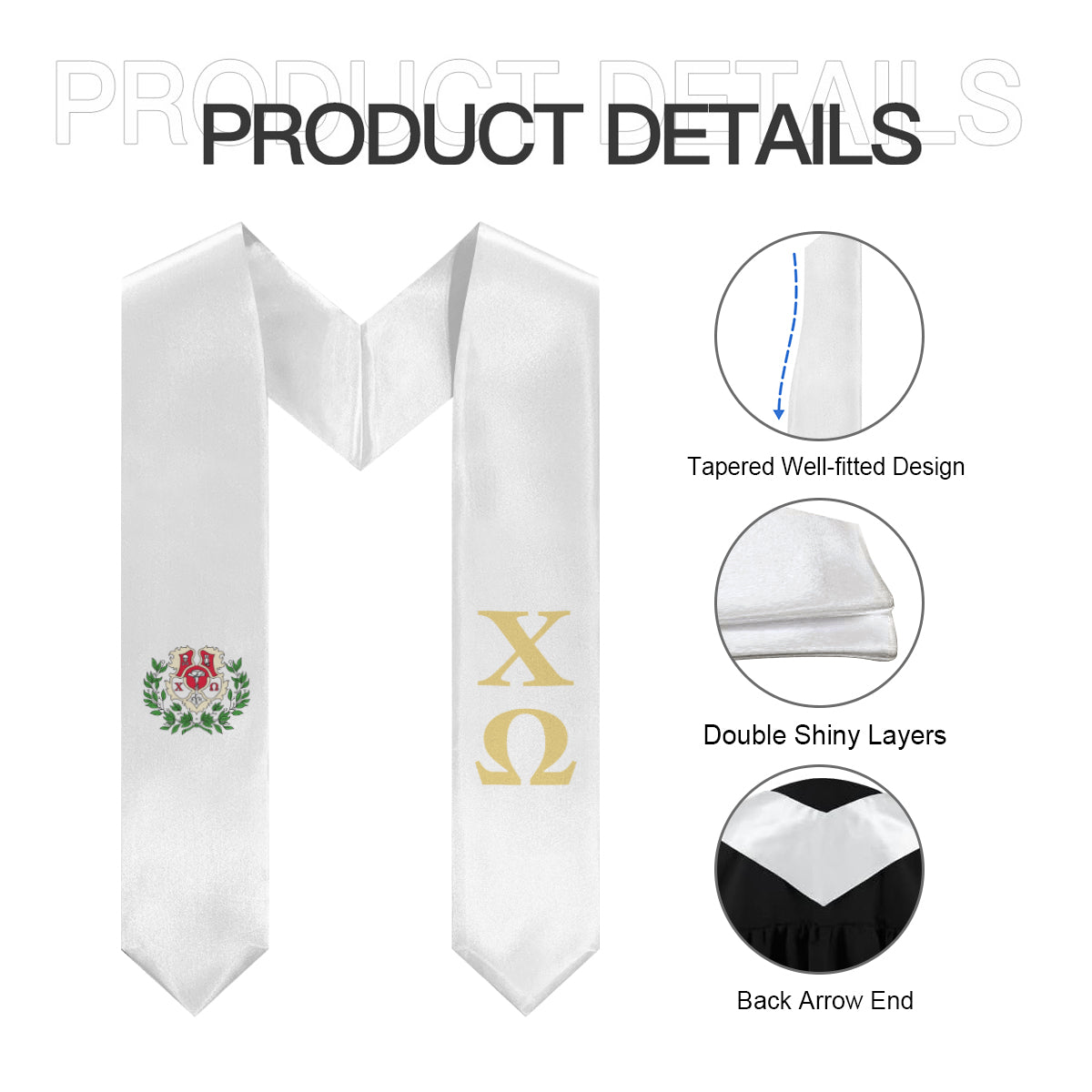 Honor your Chi Omega sisterhood with this classic white graduation stole featuring bold straw-colored block letters and the official ΧΩ crest. Clean and timeless, this stole perfectly balances tradition and style — making it the ideal accessory for your graduation ceremony and lifelong memories.