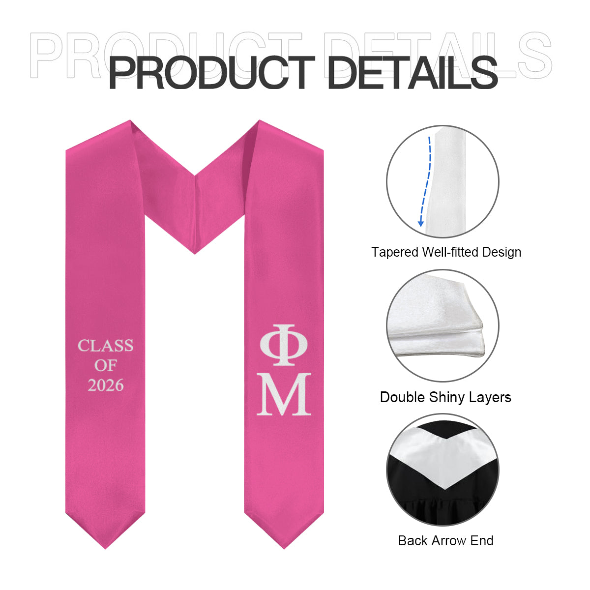 Walk the stage in Phi Mu style! This Class of 2026 stole in carnation and white features bold ΦΜ letters and graduation year accents. Perfect for senior photos, graduation, and celebrating your sisterhood in a fun, stylish way.
