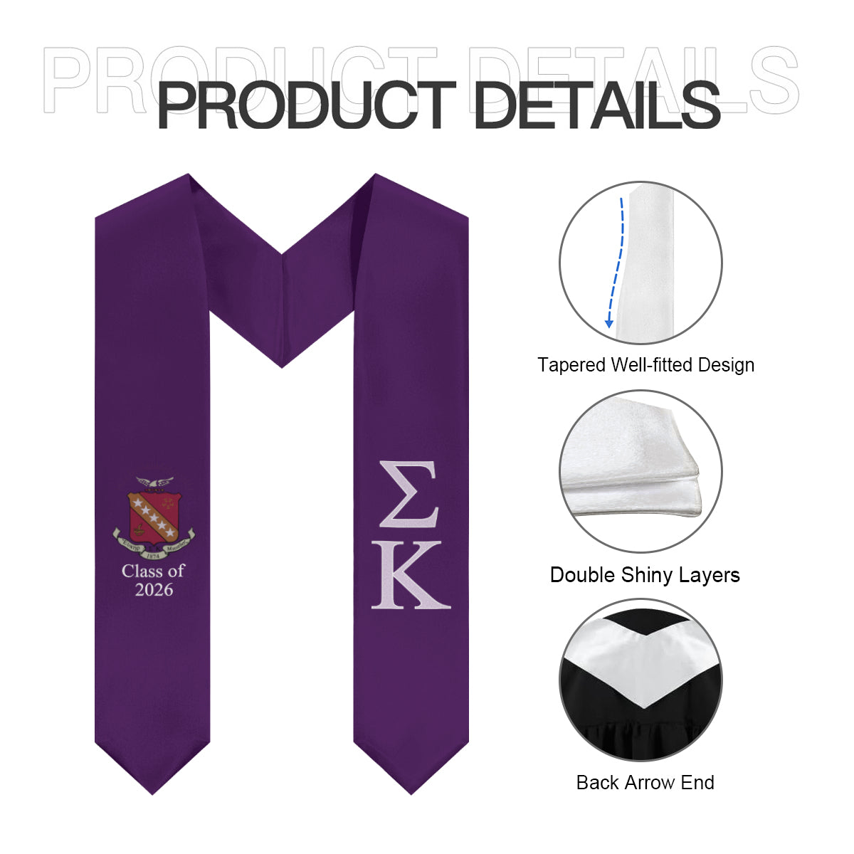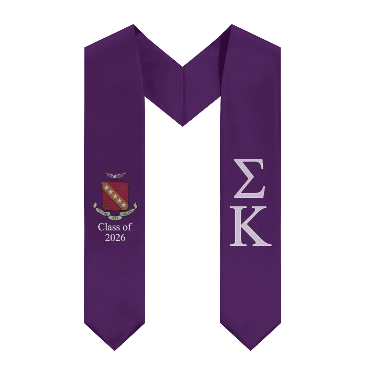 Celebrate your Sigma Kappa journey in style with this stunning purple, lavender, and white graduation stole. Featuring elegant Greek letters and the official ΣΚ crest, this stole brings sisterhood, tradition, and sophistication together for your big day.