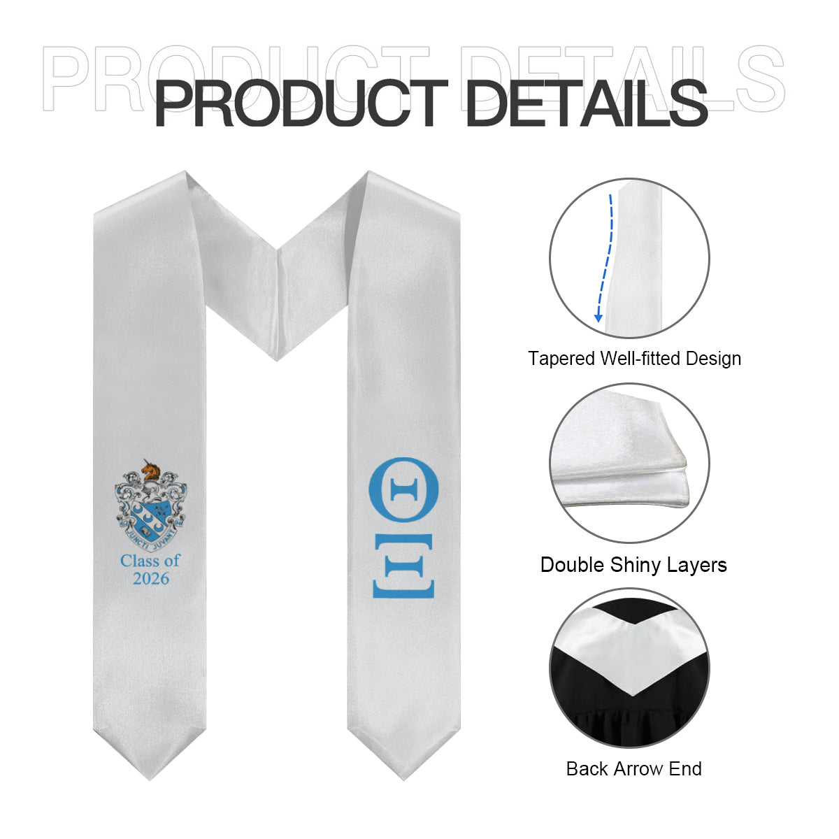 Celebrate your Theta Xi achievements in style with this Class of 2026 graduation stole. Featuring the Theta Xi crest, this silver and azure stole adds a polished, collegiate touch to your graduation attire. Perfect for photos, ceremonies, and keepsakes, it’s designed to honor your chapter pride.