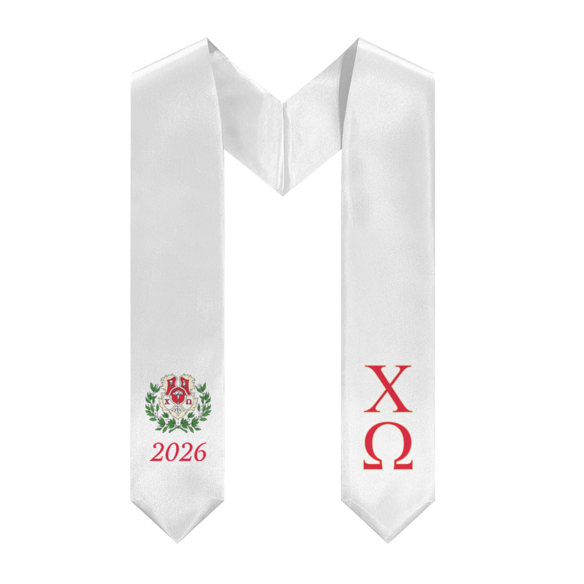 Celebrate your Chi Omega journey with this Class of 2026 graduation stole. Designed in white with cardinal and straw details, it features the sorority crest and class year for a timeless, photo-ready look. Perfect for walking across the stage and keeping as a meaningful reminder of your Chi Omega experience.