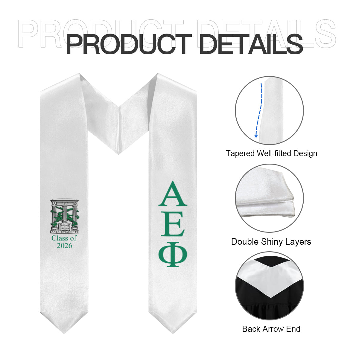 Celebrate your Alpha Epsilon Phi Class of 2026 in style with this elegant white and green stole. Featuring the official crest, this stole is perfect for graduation day, senior photos, or as a cherished keepsake to honor your sisterhood and accomplishments.